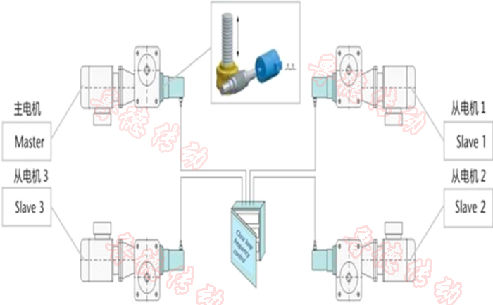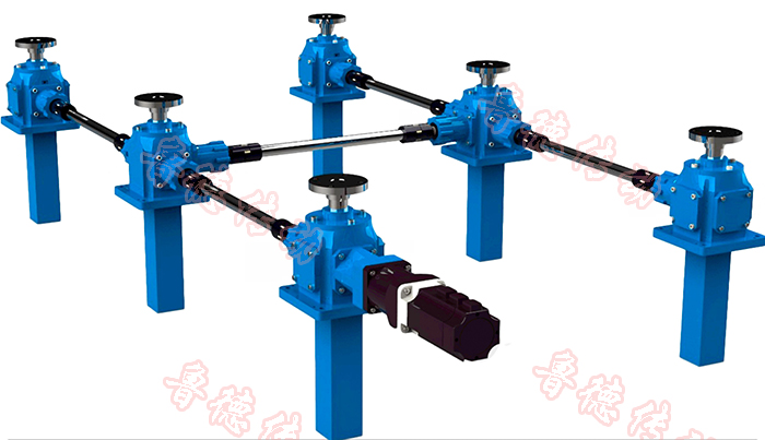 絲杆升降機(jī)與轉(zhuǎn)向器、連接杆、聯軸器等附件組合,用一台電機驅(qū)動(dòng),保 證平台同步穩定運行。在無法(fǎ)布置機械聯(lián)動的工(gōng)況中還可采用(yòng)電氣控製實現聯動,以絕 對值編碼器以及PLC控製來實現同步定位精度。