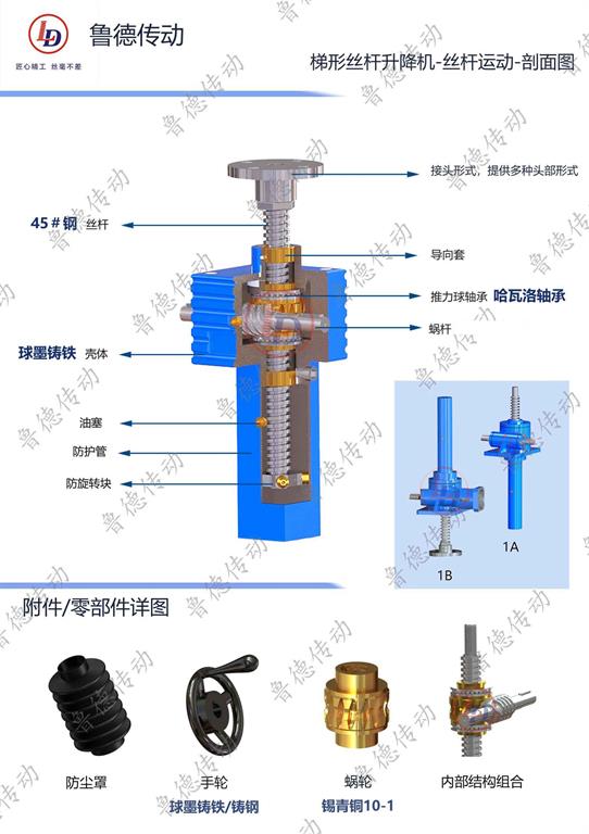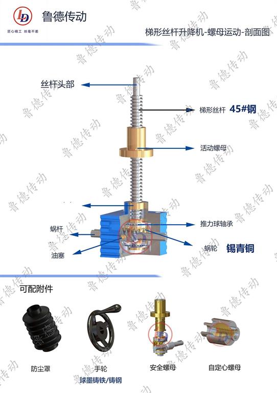 升降機絲杆和分為梯形絲杆(gǎn)/滾(gǔn)珠絲杆/不鏽(xiù)鋼絲杆,采用台灣TBI和上銀的軋製工藝,達C7標準,不鏽鋼絲杆采用304或316材質加工(gōng)而成,耐磨耐腐,適用於食品、醫(yī)療等(děng)行業。蝸輪使(shǐ)用錫青銅10-1,銅材質采用離心澆鑄工藝,材質更耐磨。蝸杆使用45#鋼,阻力小,提高傳動效率(lǜ)。 蝸輪使用錫青(qīng)銅10-1,銅材質采用離心澆鑄工藝,材質更(gèng)耐磨。