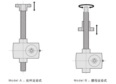 SJ係列絲杆升降機有兩種運動型式即:ModelA型-絲杆運動螺旋升降機;ModelB型-螺母運動螺旋升降機