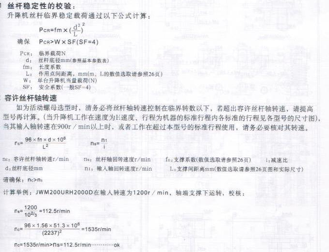 升降機的容許_載荷、容許外加負載、容許(xǔ)絲杆軸的旋(xuán)轉(zhuǎn)速度等項(xiàng)目進行效驗,如_過(guò)產品的數據將會對(duì)整個升降設(shè)備造成重大損傷。