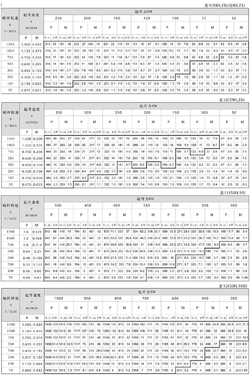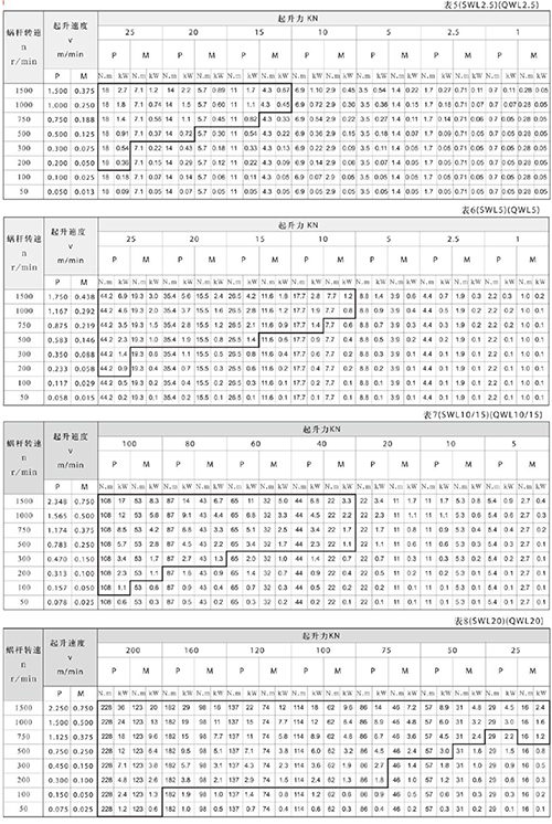 表5~表13是各型號螺杆傳動的許用起升(shēng)速度、扭矩和功率,其參數(shù)適合(hé)用於環境溫度為20°C、工作持續率為20%/h或30%/10min的條件下(xià);對粗線範圍(wéi)內的參數,使用時升降機會產生過(guò)熱,應(yīng)盡量避免選用,否則_采取(qǔ)有效措施。根據螺杆起升負荷及起升(shēng)速度,按(àn)照(zhào)下列公式計算升降機(jī)的驅動(dòng)功率,再查表5~表13,查出所需升降機型號。