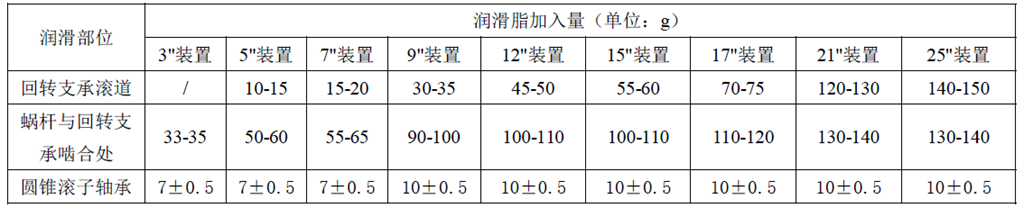 減速機有(yǒu)三(sān)處(chù)需(xū)要(yào)加以潤滑,分別為回轉支承滾道、蝸杆與回轉支承齧合處和圓錐滾子軸承。回轉支承滾道和圓錐滾子軸承出廠前已經加注潤滑脂,蝸杆與